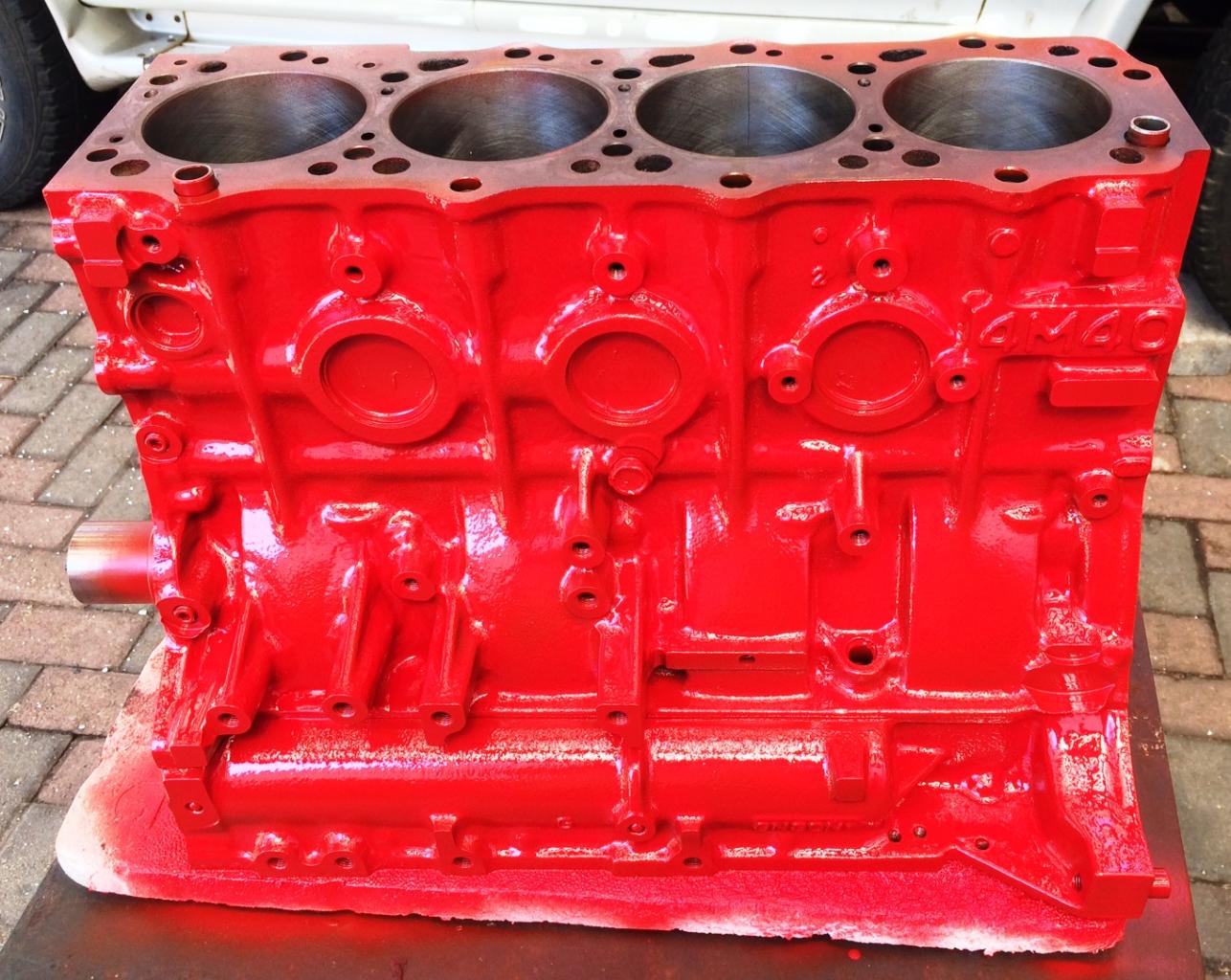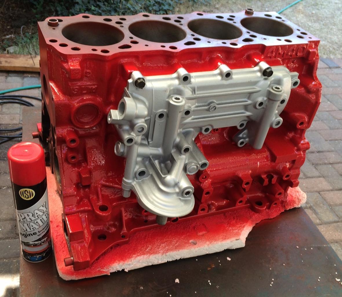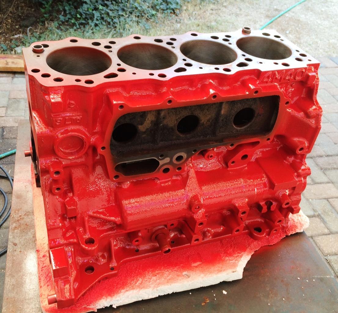 Because the outside of the block had some machining oil on it and it was not 100s clean, I masked off the top of the cylinders with some masking tape. I did this as I did not want to wash the oil off the the nice re-bored cylinders. So I brushed down the outside of the block with PREPSOL degreaser. I also scrubbed the dwell plugs with degreaser as grit and grime had deposited itself in the corners of the plugs. I allowed the degreaser to do it's thing for about 30 minutes. I then hosed down with with the Karcher power washer. After that I blew the water off with the compressor. I then prepped the parts of the engine block I did not want to paint. Then the fun began.