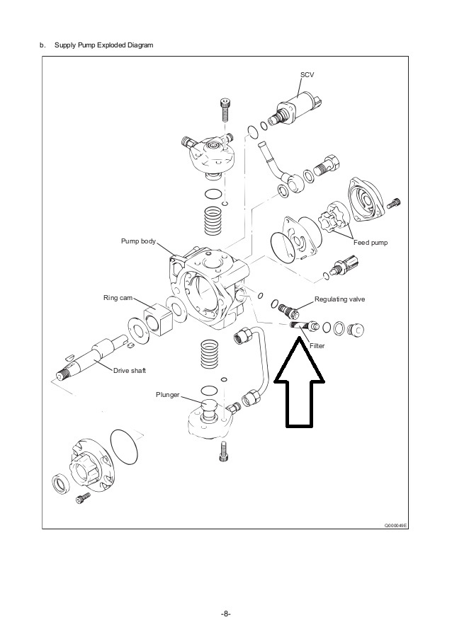 The pump is a Denso HP3 Common Rail pressure pump (the older CR pumps have the banjo bolt type filter and are a lot more accessible) and here is a diagram of the pump showing the filter. This HP3 pump is in the inverted / upside down position when fitted on the 4M41 engine so the plug is partly sideways / facing downwards. You can just reach it with the tips of your fingers down between the engine from above.