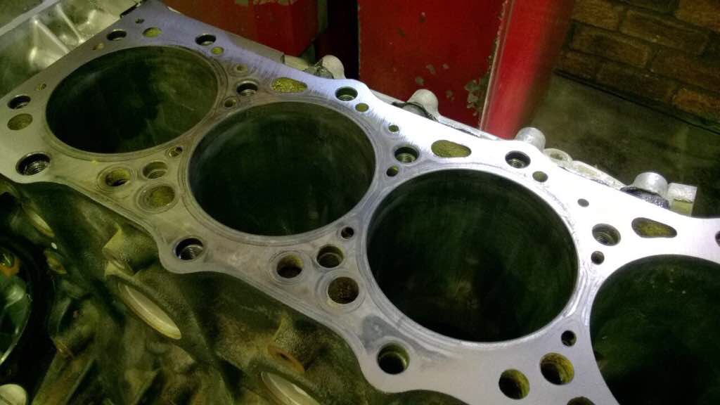 Even after I have instructed them to put the top back, they kept on looking for the gas leak and pulled the pistons and put the block on the milling machine and found that the block is warped and therefore the reason for gas leak. They could not give me a reading by how much the block was warped, but send me the attached pictures, showing the bright machined areas and darker areas which is lower (not sure by how much, but understand that 0.1 mm is the limit).