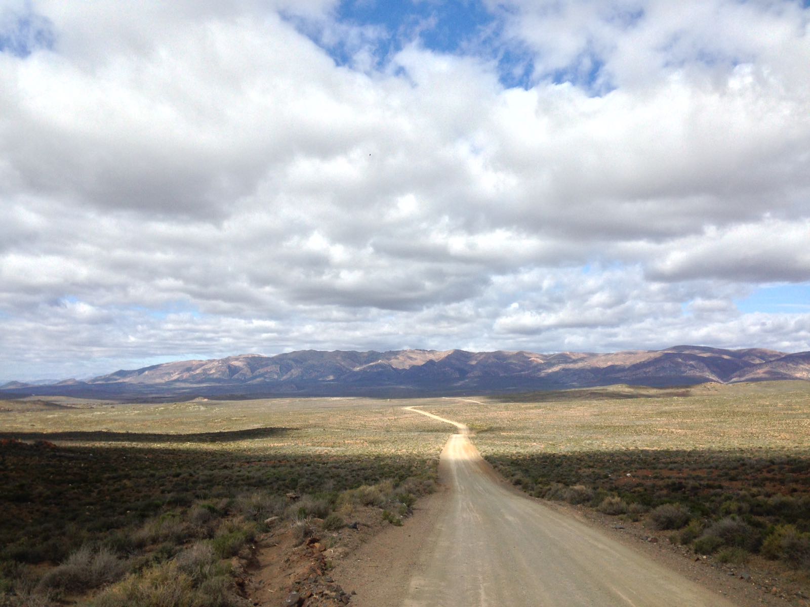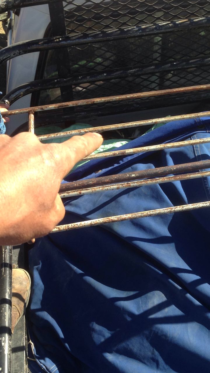 Ons is 7 km vanaf Laingsburg en Marissa ry om voer en kos vir ons te gaan kry. Russel le hier onder die seil weggekruip en verseg om te roer. Hy ry net so saam dorp toe.
