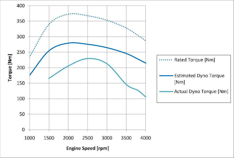 Let's look at it on a graph. I have plotted the rated torque curve, estimated chassis dynamometer torque curve (given assumed losses) and actual measured torque curve together: