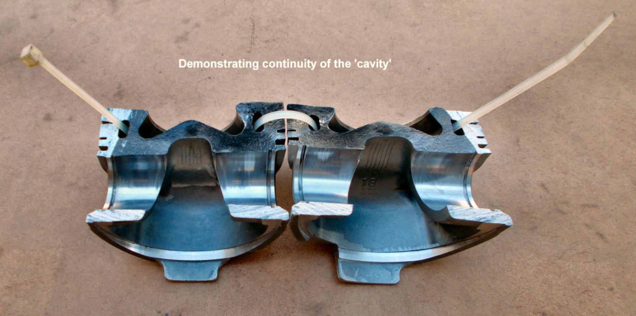 The best way to find what this strange (to me) structure was, was to complete the piston break-up by sawing with a hacksaw towards the crack through the remaining unbroken metal. The results are seen in Photo 2. The large black area shows that the crack had gone nearly all the way across the piston --- only the lower parts of the gudgeon pin sockets were still uncracked. Perhaps the crack had been developing for some time before the white exhaust smoke suddenly appeared in December. It seems that the crack finally burnt a hole through into the piston's 'cavity' (Photo 2) so discharging mixture directly from there into the crankcase. From there it would have gone via the timing chain cover into the tappet cover and through its breather into the clean air intake of the Turbo unit before emerging from the exhaust as white smoke.