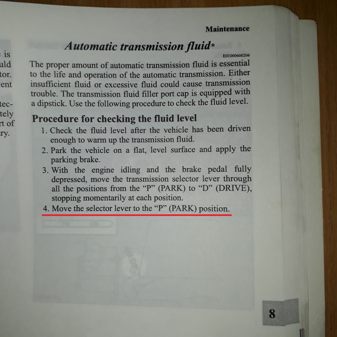 My service and owner's manual says otherwise.macjohnw wrote:I see my manual says the car must be in park, while idling, in order to check the level. Or am I mistaken?4ePikanini wrote: NOTE : The level must be checked while car is parked on level surface. It must be idling and the box in neutral..