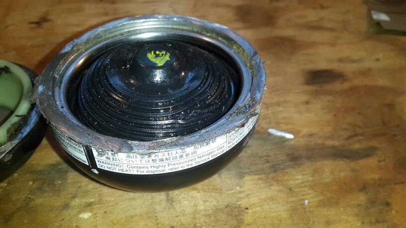Just some more feedback. I had some time and was curious as to what the inside of the accumulator looked like, so I cut it open... I first drilled a hole to release the residual pressure (and there was none) as per service manual and then cut it open along the seam with a grinder, it is quite solid as the steel is about 8mm thick. Here are the pics.