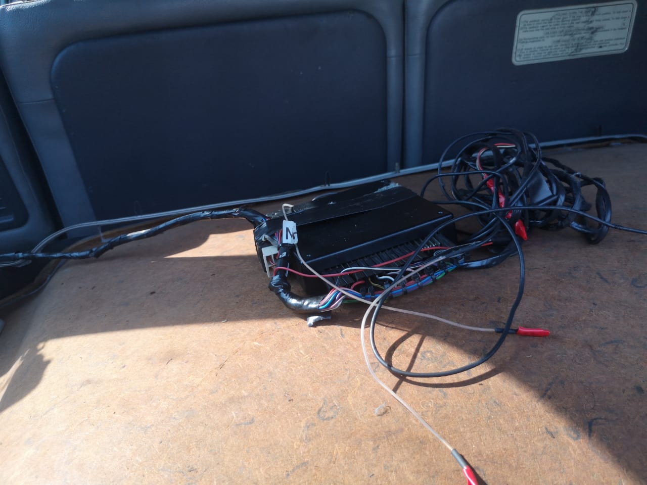 Now in the back section on top of the roof lining is a black box with many wires not going anywhere, and one wire is positive with 12v and not connected.