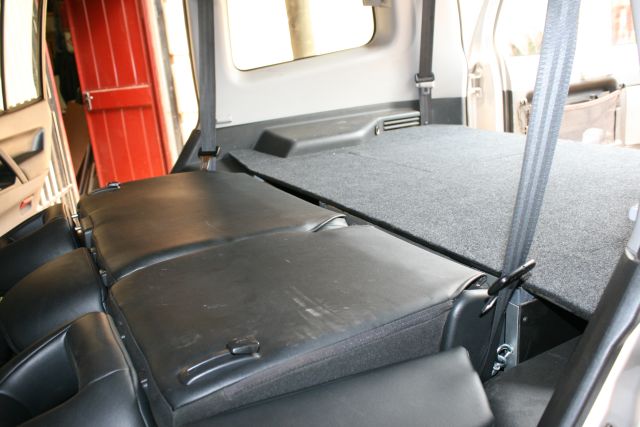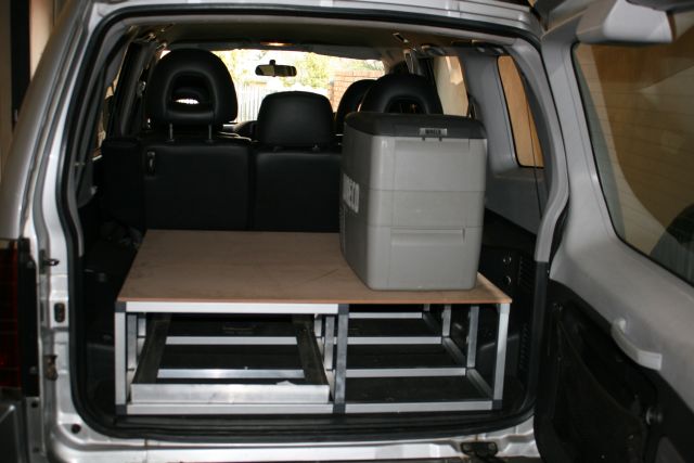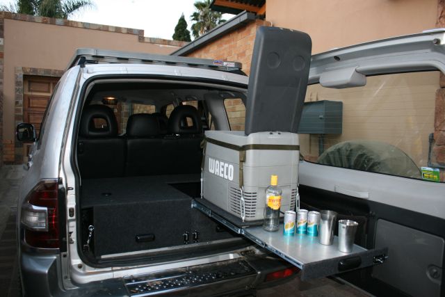 We were in serrriasss need to sort our packing in the Paj before someone went crazy. So, we planned a bit, bought a bit and built a lot. Basically we wanted place to put some wolffpacks, foodstuffs etc that needs to be portable, eg between camping kitchen and vehicle or between chalet and vehicle. So we incorporated a place to put 2 x wolffpacks. We needed a drawer to put all kinds of stuff in, and it had to be easy accessible. And then most important of all, we needed to sort the fridge to be accessible from inside as well as outside. When the fridge is removed there is a large flat surface the whole of the loading area and when the bench seats are folded flat the seatbacks and the drawer system are on the same level to form a lekka bed for stop overs.