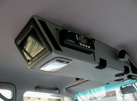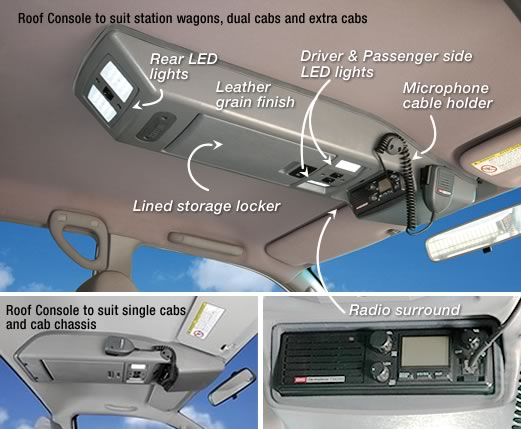 Suitable for 100 series VX and GX models ONLY. Aluminium covered with leatherette, includes 29Mhz radio (new), two LED lights on extensions, LCD screen for rear seat passengers, rechargeable LED torch (Streamlight), radio speaker, original Toyota 100 overhead lamp with LED bulb, 12V Hella Plug power point inside stowage compartment.