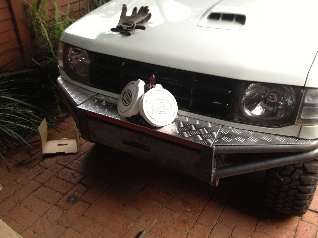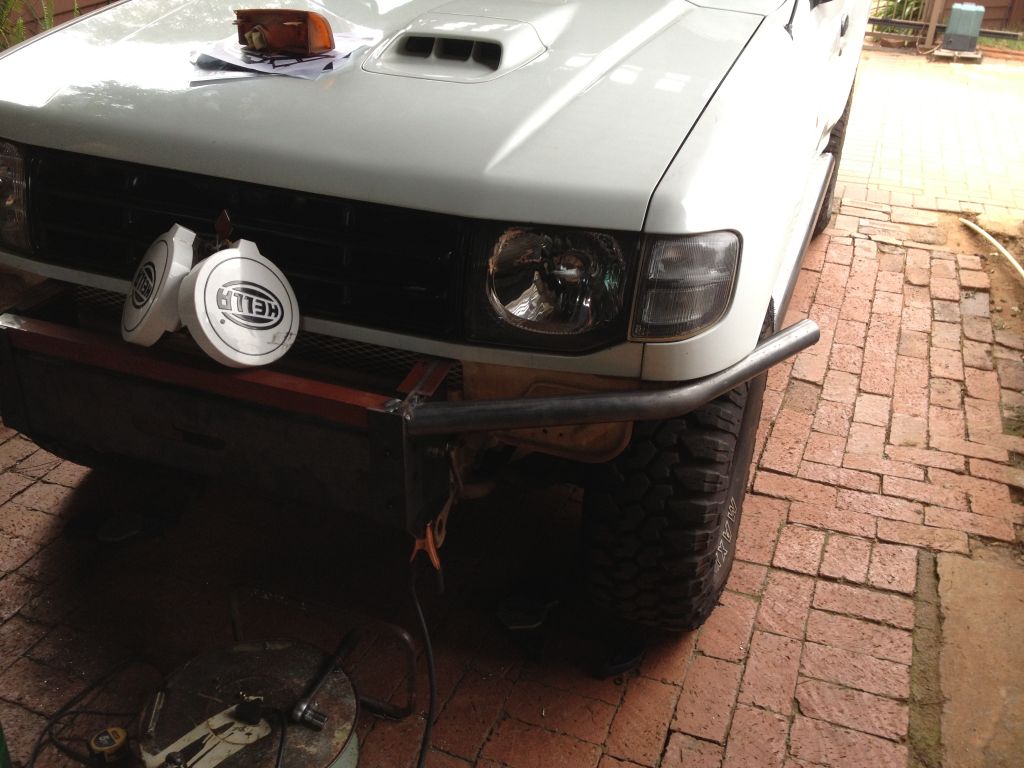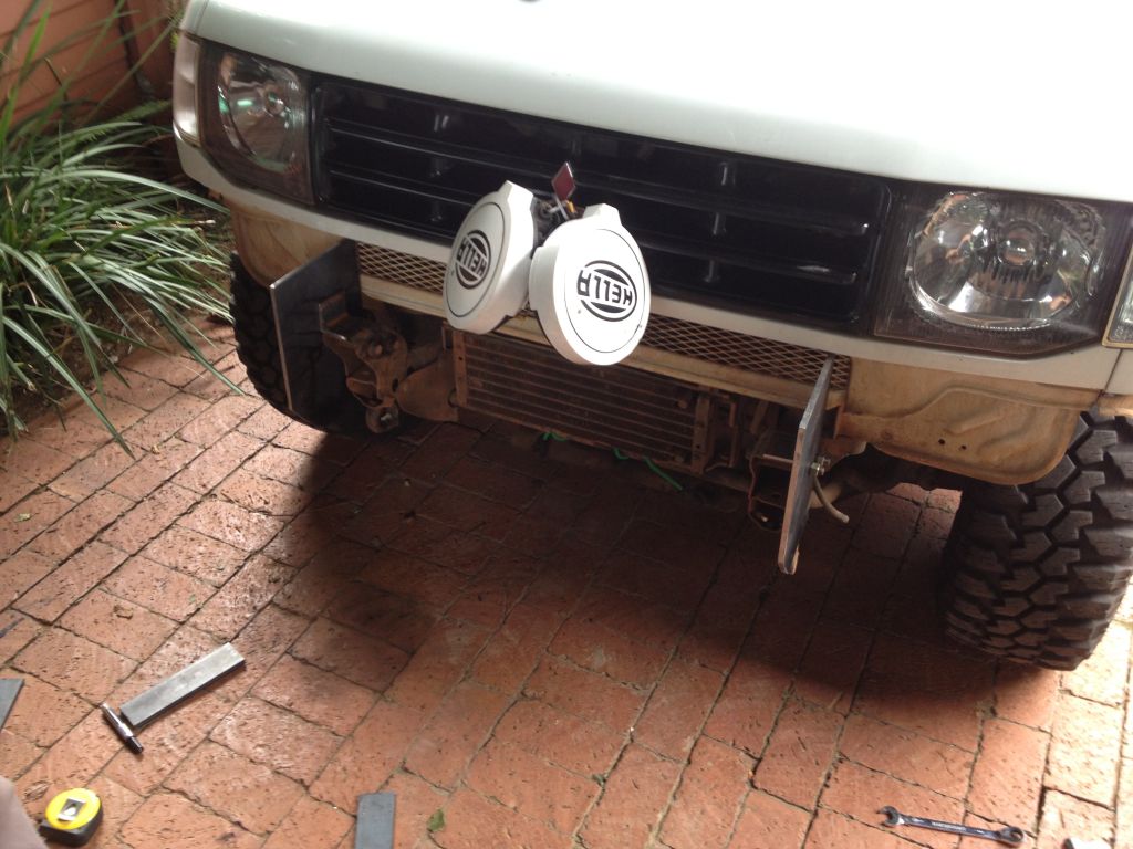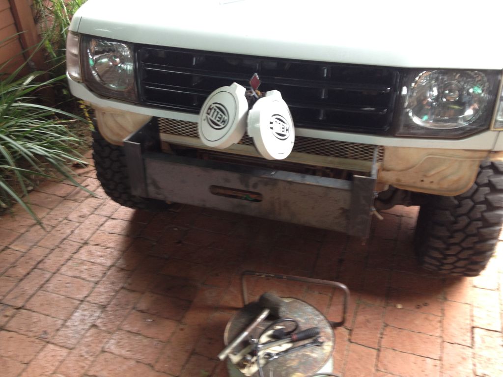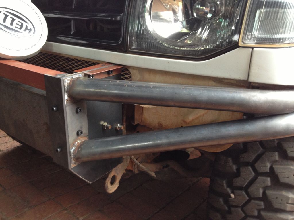 Stripped the front off, then used a 8mm baseplate, cut in half with a plasma cutter for the 'base' of the bumper. Small sections of angle iron was used to 'rest' them on the chassis. This was bolted on with the factory bolts.