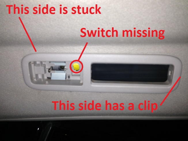 Some idiot removed the switch on one of the headlamps on the second row. I would like to replace the switch but I can't remove the cover. On the air outlet side of the cover it has a clip into the headlinig but on the lamp side of the cover it wont come loose. From the manual there are two screws, but I can't see any screws in my cover (See the attached manual and photo)