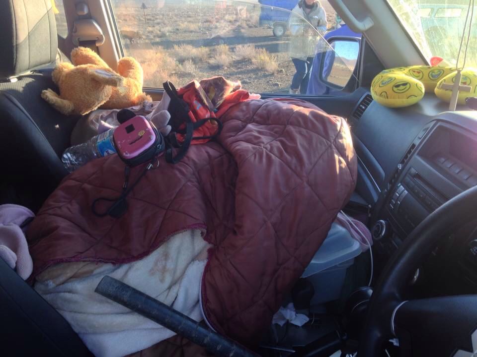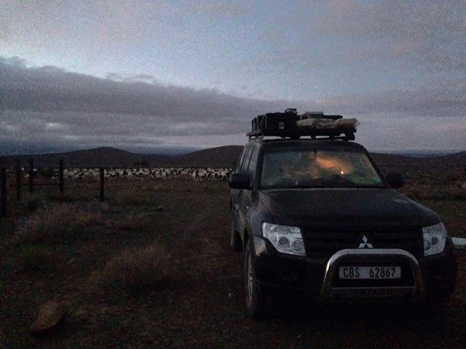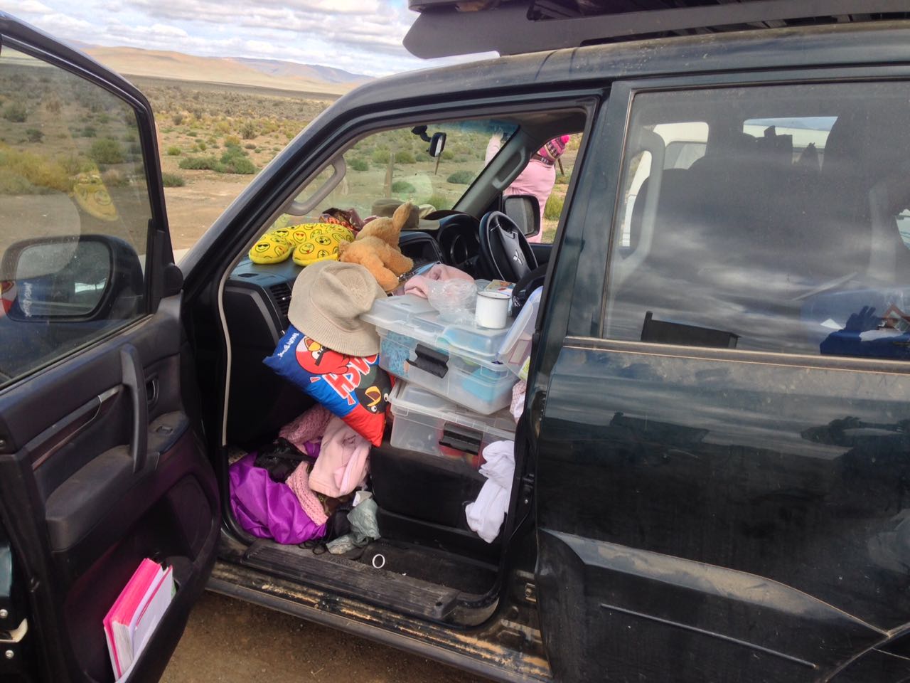 Die Pajero lyk nou al net so sleg soos ons. Alles word net ingegooi ! Dit is my geleende slaapsak en baba kombersie wat hier le.